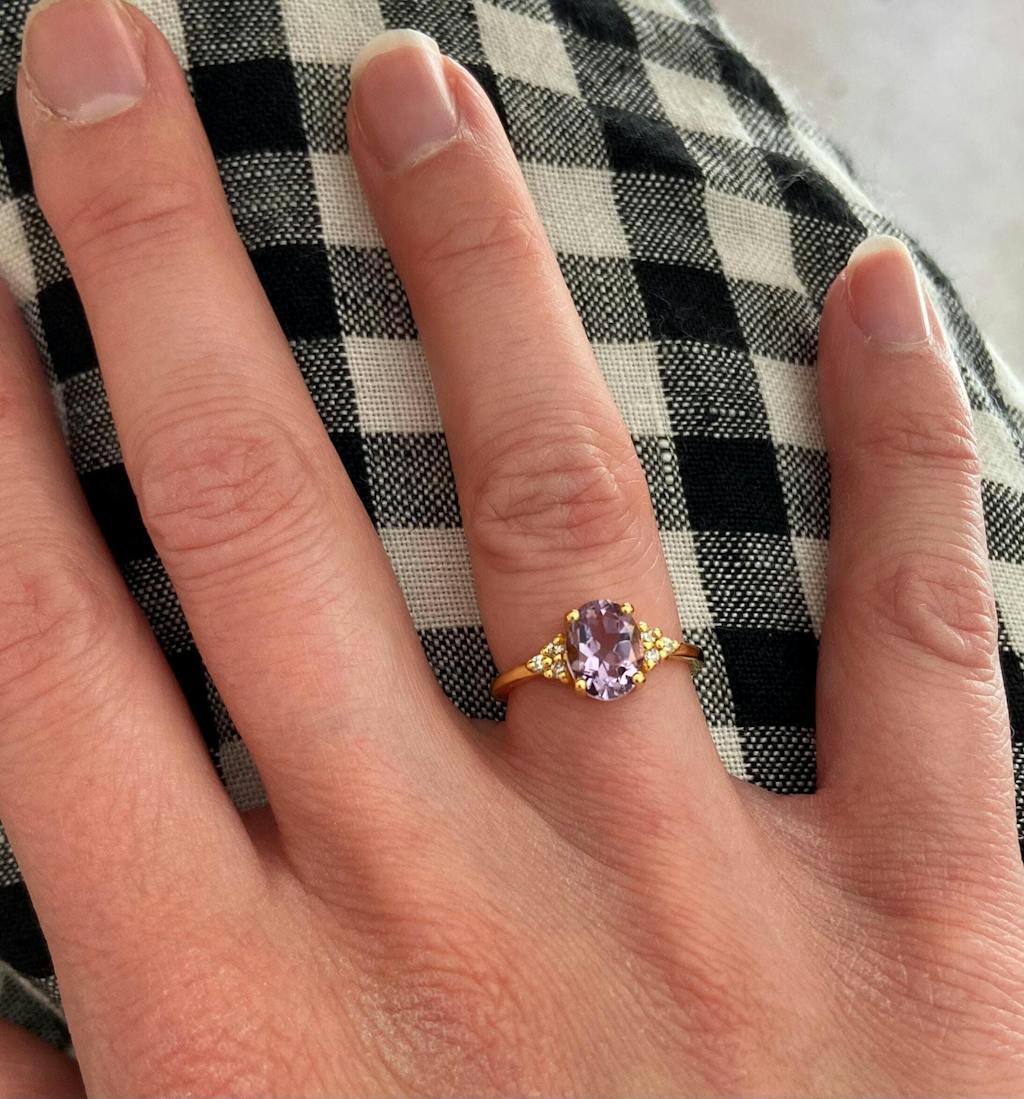 Was looking for a dainty lilac gemstone ring that I could wear to work. Came across this item after trawling through many other listings. Very pleased with how beautiful and elegant it is, love that is rhodium plated and feels sturdy.