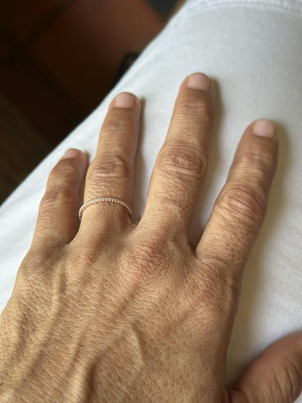 This classic eternity ring is a must-have for every wardrobe. Delicately paved with simulated diamonds all around the thin band, it is a classic jewellery piece that will easily match any outfit.