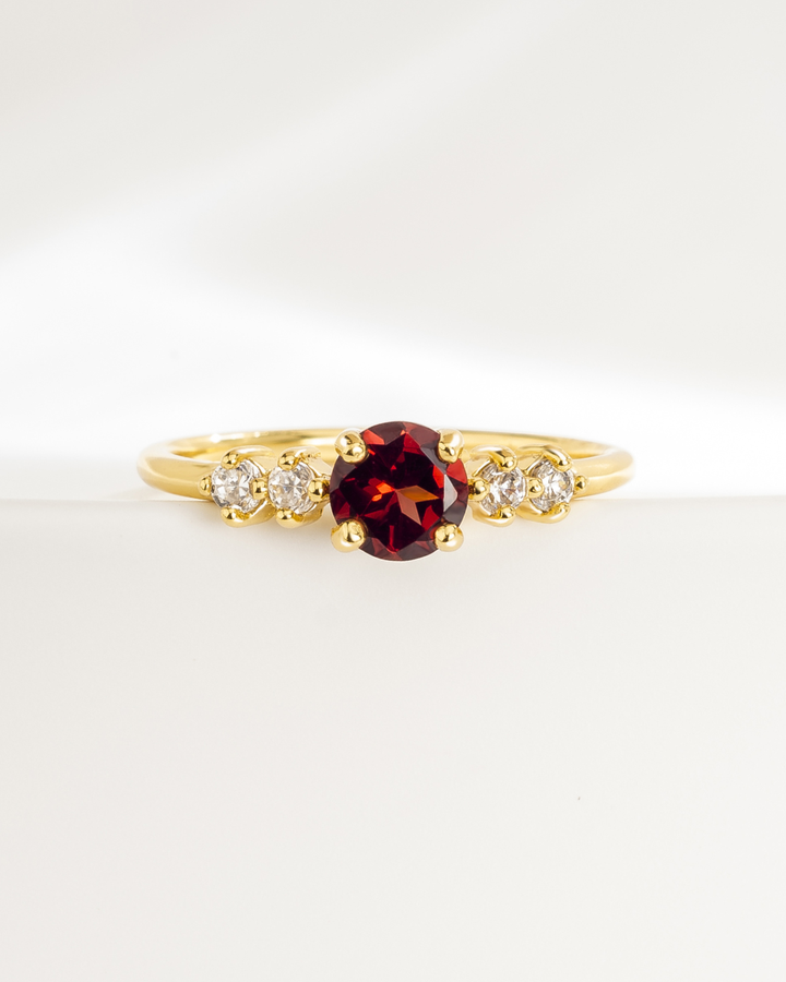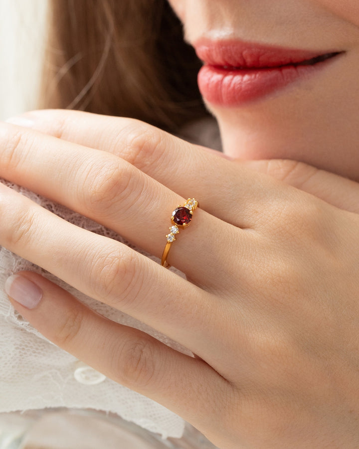Beautiful, dainty and stackable, this stunning five-stone ring is handcrafted with natural garnet - a deep red gemstone and adorned with sparkly simulated diamond. It is perfect for everyday wear as well as adding touch of sparkle to any outfit.