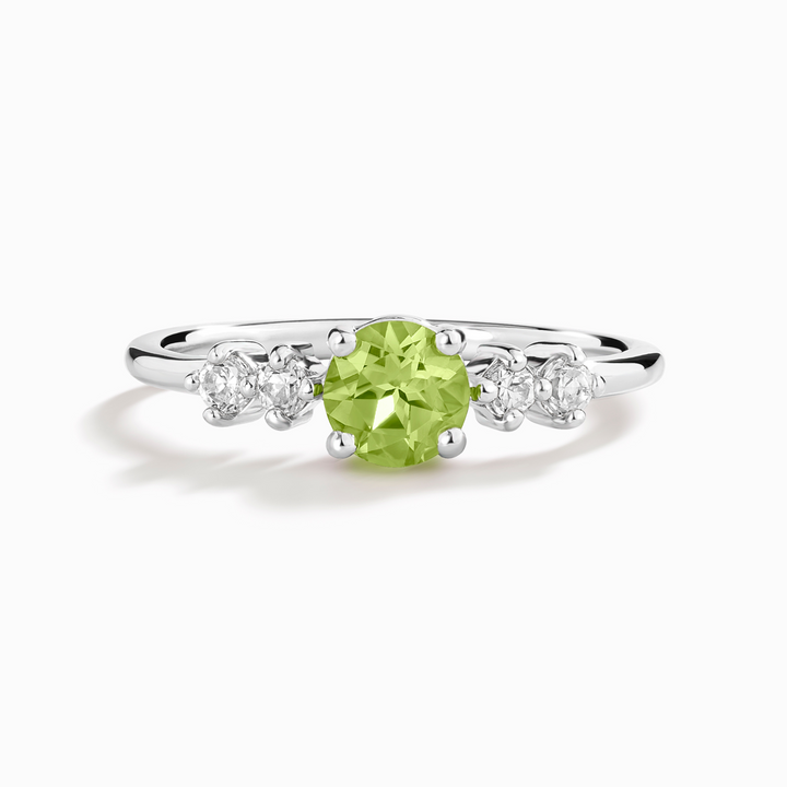 Beautiful, dainty and stackable, this stunning five-stone ring is handcrafted with natural peridot - a vibrant green gemstone and adorned with sparkly simulated diamonds. It is perfect for everyday wear as well as adding touch of sparkle to any outfit.